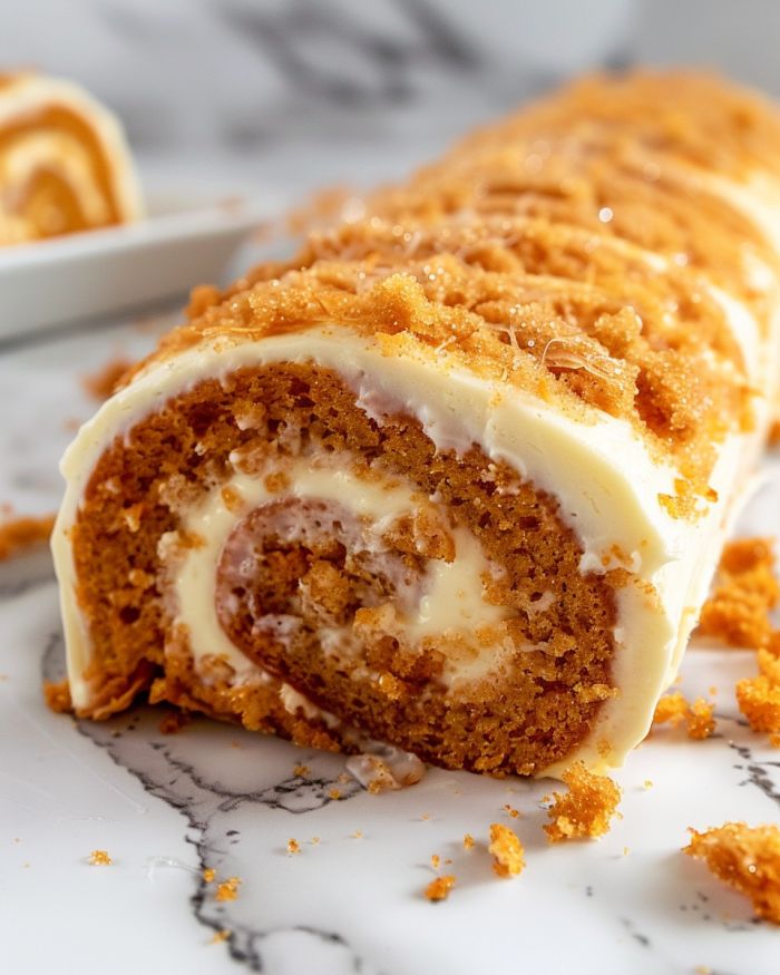 This carrot cake roll is perfectly paired with a dollop of whipped cream or a scoop of vanilla ice cream on the side. For a more festive touch, serve it with warm spiced cider or a cup of strong black coffee to complement the rich spices in the cake.