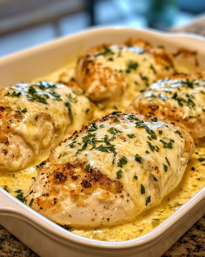 This dish pairs wonderfully with a side of steamed vegetables like broccoli or green beans to keep things light and fresh. If you’re in the mood for something heartier, consider serving it with buttery mashed potatoes or a simple pasta tossed in olive oil and garlic. A fresh garden salad with a zesty vinaigrette is also a great accompaniment, bringing a nice balance to the creamy richness of the chicken.